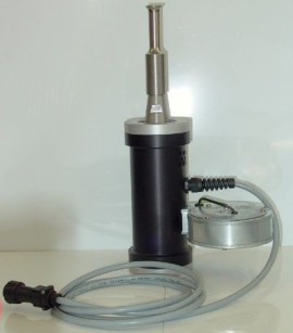 Dies zum Beispiel ist ein lüftgekühlter Ultraschallkopf, mit 500 W Dauerbelastbarkeit bei 20 kHz. Auf dieser Darstellung ist er versehen mit einer Dissolver-Spezialsonotrode zum effizienten Vermischen von Flüssigkeiten.